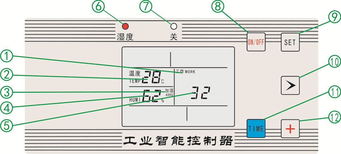 ⑹ “濕度”輸出指示燈:濕度繼電器輸出,亮。